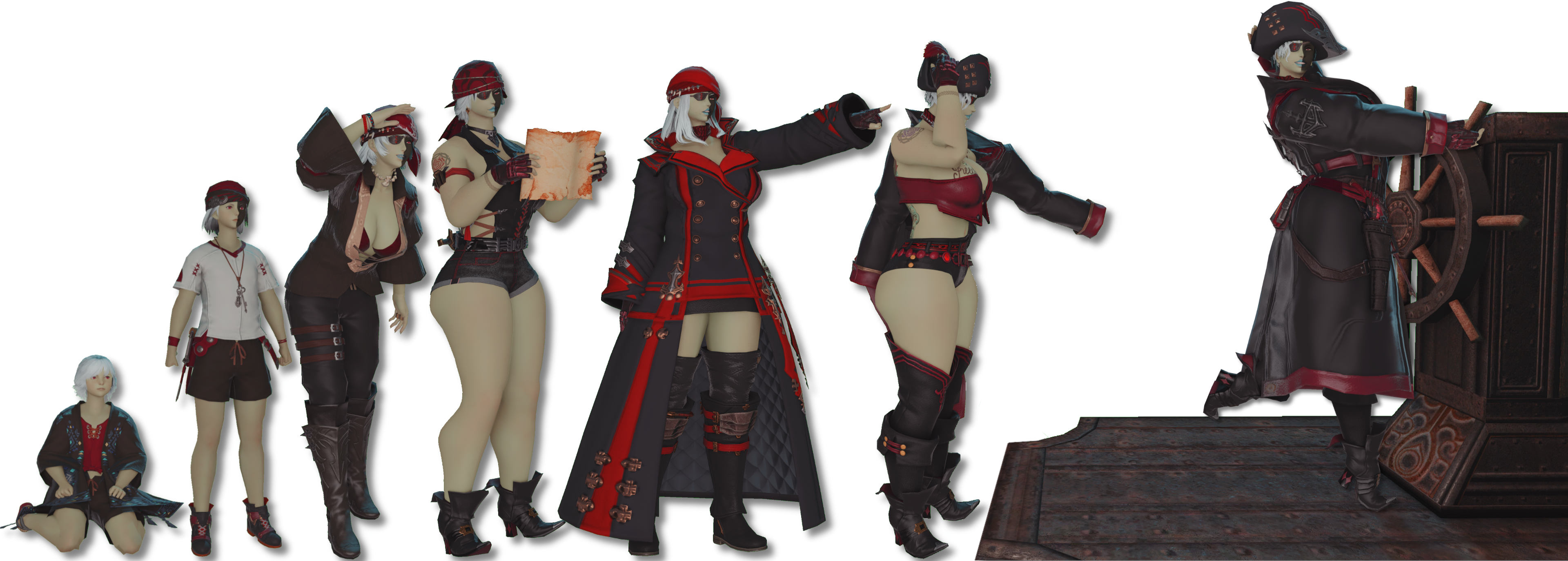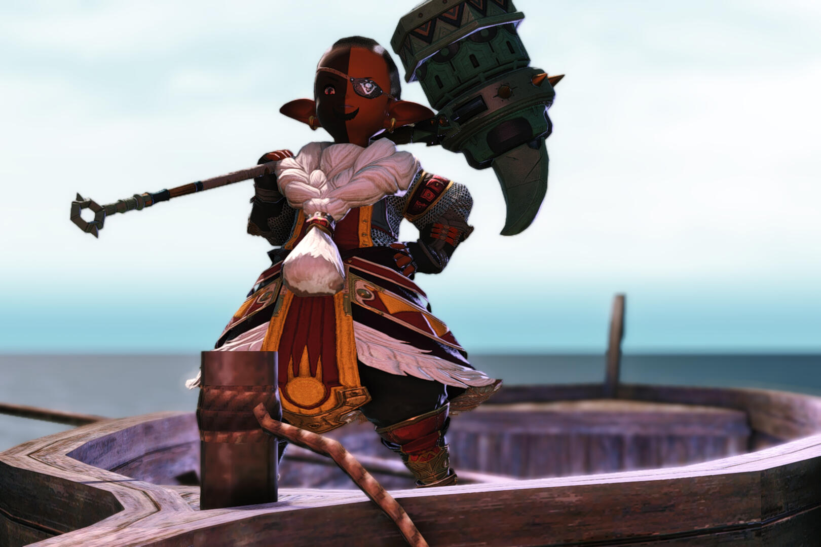 Since D'navi's passing, Skala has made a name for herself as a pirate, proclaiming herself "the Emerald Queen of the Ruby Sea." She's amassed a loyal crew to man her ship, the Emerald Cog, and together they fly her very own jolly roger, calling themselves the Emerald Pirates. While some respect her chosen title, others mock her, calling her "Two-Face" behind her back.In the Ruby Sea, Skala became an expert at deceiving Garleans and Confederates alike, making a living using her skills both nautical and mechanical as well as her quick wits smuggling both people and things across these waters. Of course, she didn't do it for free. She charged her clients lesser tithe than the Confederacy would ask, and guaranteed them safety from the Empire.Unfortunately, this life too is upended after the installation of a new Doman viceroy: Yotsuyu goe Brutus. Outraged that the Confederacy has gone unchecked for so long, she declares all who pay the Tithe to be enemies of Garlemald. Even Skala would not continue to brave these waters under such circumstances, so she and her Emerald Pirates decide at last to return to Eorzean waters.Emboldened by their time in the East, they now raid Garlean and Eorzean vessels alike, quickly gaining the attention of the Maelstrom. Before long Skala and her crew are captured by none but the Admiral herself. Impressed by her skills at sea, the Admiral offers Skala a position at the Grand Company of the Maelstrom instead of punishing her for her crimes. She doesn't entirely trust the Admiral, but seeing little choice, Skala accepts the offer, vowing to only raid imperial vessels in the future.