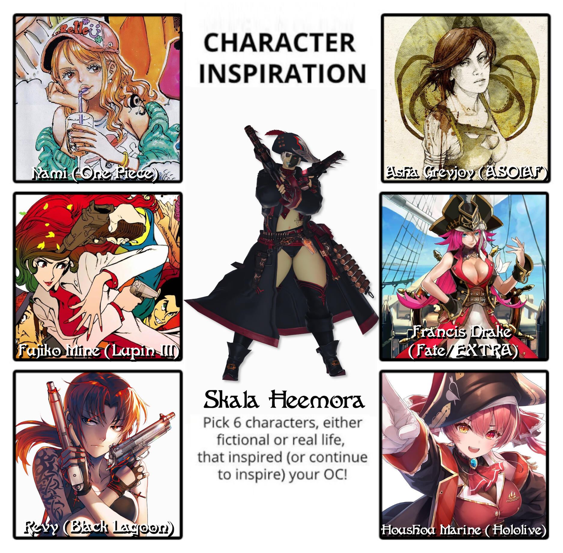 -Skala, when asked if she's doing anything this weekendA seasoned pirate, Skala is a free spirit who loves all things adventure. She dreams of seeing all the wonders the world of Hydaelyn has to offer, and revels in the scraps and the detours she gets into along the way. She loves adventure, but she also loves shiny things, particularly jewels and machines. She also loves to tinker, inventing all kinds of gadgets of various effectiveness. She even fashioned for herself a pair of Aether-fueled pistols she affectionately calls "me darlin' Scrappers."Skala can very selfish, as well as greedy. When she spies something she wants, she'll do anything to get it, whether it's a shiny piece of treasure, some machine part she wants, or even a man who's caught her eye. She's a woman who lives true to her own desires, sometimes without regard for the people around her.However, she also highly values friendship and camaraderie. When she considers someone a friend, she will do everything in her power to support their freedom the same way she would her own.