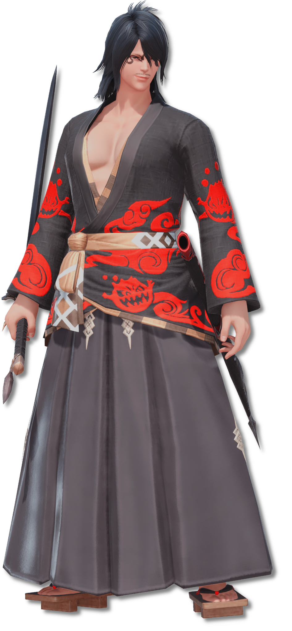 A Doman Samurai with a penchant for mischief, Takagi was exiled from his homeland, and when his would-be refuge in the Confederacy turned out not to his liking, he found himself hunted for a deserter. It was in such circumstances that he first met Skala Heemora, and promptly fell in love. Though his feelings were unrequited, he devoted himself to her service, becoming the First Mate of the newly-formed Emerald Pirates.After Skala joined the Maelstrom, he continued to serve as her right-hand man, rising to the rank of Storm Lieutenant.Eventually, however, he betrayed her to a senior officer who had a bone to pick with his Captain, fleeing Eorzea with as much of the crew's treasure as he could carry. His current whereabouts are unknown.